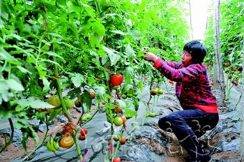 12月19日,一名村民正在示范园里打理西红柿。示范园采取企业经营模式运作,长期吸纳120余名村民就业,人均年收入3万余元。目前,合作社注册“乐稼园”品牌,认证樱桃番茄、黄瓜等5个绿色食品。