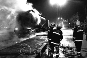 本报济宁12月29日讯(记者 张林 通讯员 夏嘉豪)27日凌晨,高新区柳行立交桥附近,一辆行驶中的水泥罐大货车,后轮突发自燃。高新公安消防大队队员迅速行动,将大火扑灭。事故没有造成人员伤亡。 27日凌晨0时32分,高新区公安消防大队接到“119”指挥中心派警,位于327柳行立交桥东的申科汽车销售服务有限公司附近一辆水泥罐货车发生车胎起火。接到报警后,同济中队迅速出动赶赴现场。 中队官兵赶到事发现场,发现货车右侧浓烟滚滚,后车胎冒出熊熊火焰,火势距离油箱较近,已严重威胁到货车安全。勘察现场情况后,中队指挥员迅速下达命令出一支水枪对着火轮胎进行火势控制,另一支水枪利用泡沫消防车直击火点将大火扑灭。为防止车轮内部阴燃,中队官兵利用泡沫枪大范围对货车后部进行喷洒已确保火灾不会复燃。 经过了近30分钟的努力扑救,大火最终被扑灭。据了解,货车着火原因初步确定为轮胎自燃,具体原因正在进一步调查之中。