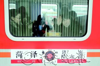 | 菏泽火车站陆续通车,图为市民正乘坐菏泽发往哈尔滨的列车。