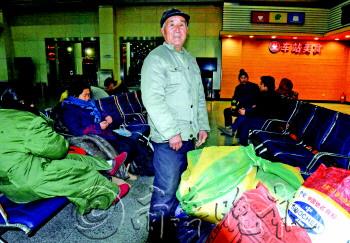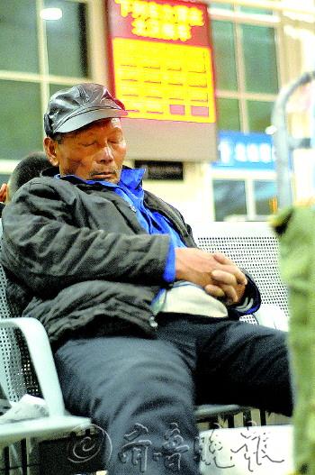 | 为了省钱,73岁的菏泽单县谢集镇郑桥村村民郑红军,准备在济南长途汽车总站候车厅里将就一晚。他在长岛一工地打工三个月,领了500元工钱。2013年12月31日下午,花138元坐大巴赶到济南,准备第二天回家。 本报记者 郭建政 摄 |  | 济南铁路局济南车辆段济南库检车间内,检车员秦长江拿着手电和锤子,在1.2米深的维修地沟内对济南开往南通的K772次列车进行检修。早上8点,他将坐上回家的火车,陪1岁半的女儿过节。 本报记者 王媛 摄 |  | 67岁的李树三在菏泽火车站临时候车厅打盹儿。老家丢了17只老母鸡和2只大公鸡,他着急回去安慰伤心的老伴。