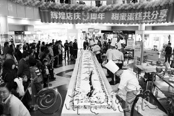 2013年12月31日晚,在贵和购物中心济宁店,恰逢九周年店庆,这里的营业时间被延长至凌晨。而在一楼圆天井区域内,一块长达9米的巨型蛋糕摆放在这里,等待着在跨年时刻与市民共享。 本报记者 马辉 通讯员 刘东亮 摄