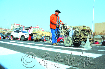 2013年12月31日,烟台市交警支队的工作人员在清泉路和新桥南路喷绘斑马线。春节之前,交警支队会根据各大队汇报情况在市区各道路上喷绘新斑马线或刷新已经褪色的斑马线,排除交通隐患,也提醒司机留意新斑马线,注意减速让行。