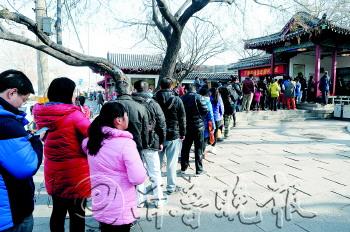 ◤1月1日,千佛山公园正门,大批登山市民发现2013年的旅游年票不能用了,纷纷现场办新的,结果人太多,排起了长长的队伍。 本报记者 周青先 摄