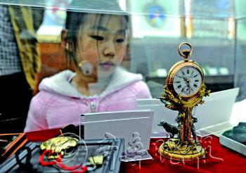 1日,小朋友对有着两百年历史的老钟表看得入迷。当天,刘荣光“迎新春钟表展”趵突泉公园万竹园杏院开展,三百余件展品中其中既有乌利文珐琅镜像对表等珍稀西洋表,也有我国清代的苏钟和广钟,展品不时发出悠扬的报时声,唤起我们记忆中的一段旧时光。 本报记者 张中 摄