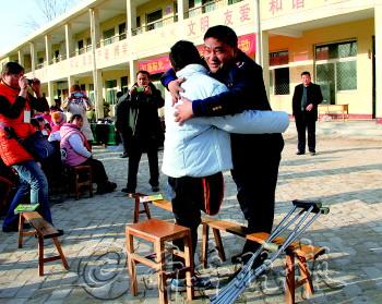 “看我的新衣服好看不!”2013年12月31日下午,穿上爱心人士送的棉衣的黄堽镇大张庄小学三年级的张福荣高兴地和同学在校园内玩耍,很兴奋。