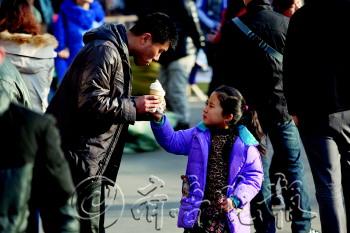 | 图为1日,市区温度回暖,街上的市民用甜筒“降温”。