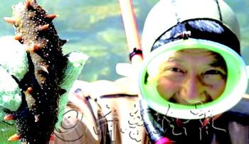 | 养殖基地的工作人员展示刚刚捕捞出的海参。 |