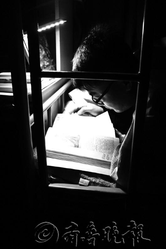 | |  | 张富友和舍友为了考研,每天晚上都学到很晚。 |  | 杨辉(右)和他的对铺喜欢对着头学习,方便讨论,在他们心里只有考研。 |  | 工作人员正忙着接听电话。 |  | 接线员的工作要用到四台电脑。 |  | 刘状总过了24点才开始洗漱睡觉,因为不断电的每一分钟他都用来学习。 |  | 怕冷的李忠浩熄灯后总喜欢在被窝里看书。 |  | 接警之余要整理各项报警资料。 |