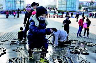1日,元旦节当天,在幸福公园内,不少市民趁着假日带着家人孩子外出游玩,在万福图景点,家长带着孩子踏福迎新。