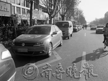 | 柳园路新东方广场附近,私家车把公交车道当作“停车位”。 本报记者 王瑞超 摄 |