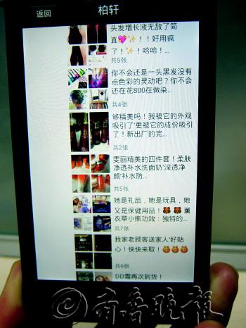 文/片 本报记者 任磊磊 “微销”不用囤货 发布信息招徕生意 如今在微信上,随处可见各种购物信息,把朋友圈变成了“购物圈”。 “近期大量朋友都在微信朋友圈里卖货了,天天都在朋友圈里刷屏,我是不是也该考虑开创第二职业?”近日,济南市民周先生在朋友圈里发了这样一条信息。在受访的市民中,和周先生有同样感受的人不少,朋友圈已经不再是单纯的发布心情、状态的地方了,越来越多的朋友加入代购行列,每天更新的代购货品、原单、打折等促销信息让人目不暇接。很多品牌通过开设官方账号、公共账号等方式,将“卖场”直接搬到了微博、微信等平台上。 微信用户“qianqian633957”是济南某剧团的签约歌手,除了正常的工作外,她的兼职工作就是经营朋友圈做微信营销。打开qianqian的朋友圈,货架上商品非常多,各种品牌护肤品、玩具、丝巾、保暖袜等等货架上都有,而且声明是正版国外代购的真品。 别看“货架”上商品很多,但是实际上卖家手里一件库存都没有。在接受采访时,qianqian对此也并不讳言。“我是做微信代购的,会经常发布各类代购货物的信息,有朋友圈好友看到后,就可以微信联系向我购买。我有专业代购者到各地扫货,现买现卖,根本没必要囤货!”