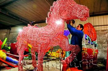 | ▲4日,济南华山镇,来自四川自贡的师傅们正在忙着制作花灯,为一年一度的趵突泉花灯会做准备。