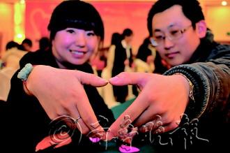 1月4日下午,齐鲁晚报·今日威海联合环翠楼街道办东北村社区成功举办2013—2014年跨年相亲大会。120余位优秀单身男女青年参加,最终,两对男女结缘牵手。图为10号男嘉宾官华正和44号女嘉宾陈方媛“牵手成功”。