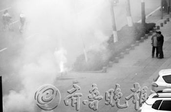 1月6日是农历腊月初六,德州市许多新人定在这天办喜事。当天的严重雾霾,没有让人们放弃点燃喜庆的烟火,图为德城区东风路一酒店门前点燃的烟火让空气变得更加呛人。 本报记者 王小会 孙婷婷 摄影报道