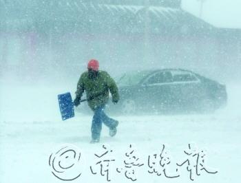 | 1月5日,在美国伊利诺伊州的尚佩恩,一名男子提着雪铲在暴风雪中跋涉。 新华/美联