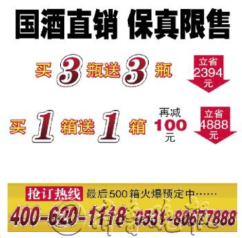 600年 国宝级 老窖池发酵 此次转为民用酒的五粮液10年陈酿,出自国宝级的明代600多年的老窖池,窖池中丰富的微生物和香味物质,使其酒体丰满醇香、各味协调。懂酒的人都知道,酒质的高下,取决于窖池的年龄:市面上常见的五粮液,大多出自普通几十年的窖池。因为600年的老窖池仅16口,年产量仅1吨,目前该窖池已被国务院列为第七批文物保护单位,即将被封存,所以该窖池酿出的酒就会和正宗的宜兴紫砂壶一样,称为稀缺资源,五粮液红如意10年浓香型是五粮液嫡系发酵,长年陈酿,精心勾兑而成。在酿造工艺上精益求精,讲究品质保证,使得该酒具备了极高的收藏投资价值。 五粮液52度万事如意酒 活动公告 值此五粮液集团转型战略发展之际,为了让更多的普通老百姓都能品尝或收藏到正宗的五粮液特供国酒,五粮液集团特试水“国酒保真直销”模式,厂家直达消费者,砍掉中间层层加价,以最原始的出厂价直接面对消费者,还利于民。本次活动由厂家办事处直接供货,送货到家,取消一切中间环节,如在超市及网络上发现均为仿冒,购买之后厂家概不负责。有需要订购的顾客需拨打热线:0531-80677888提前预约,名额有限,请提前咨询以免空等。特此公告 2013年,中央领导下达了关于严控“三公消费”的指导精神,各单位用于公款消费的高档酒水明显减少。于此同时,传统名酒的价格高、排场大、不接地气,广大消费者意见频出。五粮液集团率先转变思维,号召“还酒于民”,旗下多款特供酒转为民用市场,以最低廉的价格面向社会公开发售。 五粮液率先打破白酒行业暴利模式,将品牌转向为百姓喝得起的民用市场。据了解,本次五粮液推出的万事如意(红如意)系列酒将采用厂家直达顾客的模式,取消所有中间环节,不给任何渠道以加价可能,直接以出厂价对外销售。原本要598元的万事如意,现价只要398元,而且买一箱送一箱,相当于每瓶仅3折。如此低价位的促销活动在高端酒品牌当中闻所未闻。一经推出立即引起了行业轰动。 据了解,此举一方面响应中央抑制三公消费,还酒于民的号召,另一方面也是为了打破白酒行业的层层加价,让更多的普通消费者买得起喝得起,从而彻底告别行业暴利。 本次五粮液集团推出的万事如意(红如意)酒,一直作为招待用酒及国宴特供酒,从来没有面向普通消费者,如今随着集团的转型,特供酒转为民用市场,更能见证五粮液产品的非凡品质。该酒为10年陈酿年份酒,延续五粮液52度经典香型,100%原厂原液。口感面柔醇厚,回味悠长,被相关部门指定为宴请外宾的指定用酒。无论是商务宴请,还是家庭饮用,此酒都是美好与吉祥的象征,超高的性价比,非常贴近大众对高档白酒的需求。 五粮液“国宴酒”首次公开销售 52°五粮液万事如意外宾招待特供酒,独家抢发,厂价直供,限时抢购500箱。为保证您买到的是真正的52°五粮液万事如意,五粮液集团作如下郑重承诺,如有假冒伪劣产品欢迎拨打举报热线:400-620-1118。 ■特约直销站送货上门,当场开封验货,100%原厂原瓶原液,也可去当地工商质检处检验!监督热线0531-80677888 100%原厂原窖,3折抢购,人人喝得起 五粮液这么高端的酒,现在3折就能买到,到底是真是假?很多消费者不敢相信消息的真实性,纷纷打来电话咨询。对于大家的怀疑我们是可以理解的,厂家驻地方办事处的工作人员回答:其实我们也从来没有卖过这么低价。顾客可以放心,五粮液万事如意酒是五粮液集团的原厂原液酒,酒头是在老窖池发酵的高度酒,经过调试后制成52度的经典浓香型白酒,这与所有五粮液产品的工艺完全一样,第二是我们采用厂家直销的模式,没有任何中间勾兑的可能,您拿到的每一瓶酒都有独立的防伪代码,就像人的身份证一样。您也可以到任何地方的工商质检部门检验,一旦发现有假我们立即赔偿10万,顾客可以100%放心购买。 各地疯抢:万事如意彩头好,后市有望升值 从北京,到上海,到哈尔滨,再到济南,五粮液万事如意酒每到一地必遭疯抢“快,我订6瓶,等等,再加6瓶。”“喂,给我送6箱,对,直接送到家。”“你不是说多买多送嘛,怎么还有名额限制呢?什么,一天最多就限50个名额,哎呦呦,那一次应当多订一些,剩下的送……”“不用验货,我喝过了,绝对正宗,搬进来吧……”“不为别的,就冲着国宴,冲着万事如意这名字,咱也不能落后!”…… 特别惊喜 每天前5名顾客免费赠酒 实惠聚焦 巨划算!老百姓真正买得起,送得起,藏得起! 现在拨打热线,原价598的五粮液万事如意酒,现厂家直供买3瓶送3瓶,相当于3折起售!特别推出买1箱送1箱,再减100元新年大礼包!每天前五名打进热线的顾客,我们还将免费赠送一瓶价值398元的万事如意酒。 本次活动仅限5天,全国限购30000箱,本市限购500箱,每天限量抢购100箱,先抢先得,抢完即止。正品行货,假一赔十! 抢购热线:400-620-1118 0531-80677888 商务宴请送礼:诚意足档次高,倍儿有面:商务巅峰,共襄盛举,一杯万事如意酒,订单合同签到手发软。销量渐渐多起来,而且朋友、人脉、圈子也渐渐广起来。这五粮液万事如意酒,真真的五粮液原厂真酒,牌子硬,叫的响,拿出手倍儿有面,尤其这价格,买1箱送1箱太实惠了!送客户、送领导、送同事,给员工发福利再好不过了! 婚宴嫁娶祝寿:排场足,巨划算,酒好寓意更好:这酒好啊,超级划算,又是老牌子,叫的响,喝的爽。本来我还愁买啥酒呢,这下有了这万事如意酒,孩子结婚,老爷子80