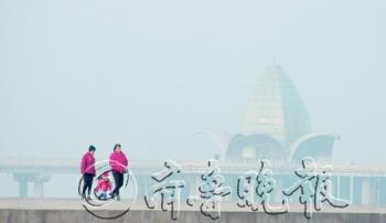 | 6日,滨海路旁的海边,游人在雾中行走,背后白茫茫一片,海天模糊难辨。 本报记者 韩逸 摄 |