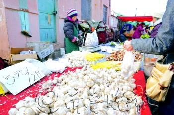 | 今年大蒜特别便宜,一斤只要2-3元。 本报记者 李娜 摄 |