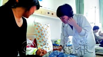 | 李春香正在为一名病情好转的脑炎患儿做进一步检查。