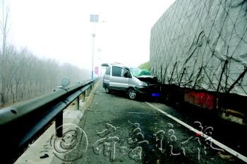 1月6日上午,在京台高速德州收费站附近,一辆商务面包车从应急车道行驶撞上一辆大货车,造成小车上一人腿部骨折,多人受伤。 本报记者 马志勇 摄