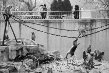 随着天气越来越冷,人民公园动物园的游客日渐稀少。图为1月6日下午,几只猕猴在游客挑逗下耍起了“锁链舞”。 本报记者 王小会 摄