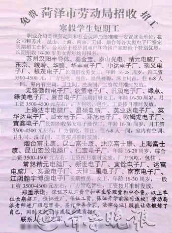 本报菏泽1月6日讯(记者 袁慧) 寒假将至,各大学正在如火如荼地进行着期末考试,不少商家也前来凑热闹,校园内的各种招聘广告多了起来,临时工和计时工成为大学生假期锻炼的好选择。不过律师提醒学子们,选择兼职时要注意了解公司是否正规,签订劳动合同,以维护自身权益,谨防用工陷阱。 6日上午,在菏泽学院、菏泽医专的校园张贴板上,贴满了各商家和用工单位的招聘信息,引来不少学生驻足观看。不足5平米的张贴板上大约有上百张招聘信息,还有很多被撕掉的,留下醒目的招聘字样。这些招聘企业涉及企业、工厂、餐饮、促销等行业,大部分是提供兼职和临时工职位,并多是按小时计工资或者业绩计算。 大三学生小秦,从大一就开始做兼职,为一些辅导机构做老师,晚上还偶尔做家教。“我一般主带英语,正好能发挥自己掌握的专业知识,锻炼了口语,又能在经济上给自己一个富足的生活,同时还减轻了家里的负担,我选兼职的辅导机构都是长期合作的,一直都很守信。 “考完试我想去超市做个促销员,正好可以挣点钱买点年货。”大二学生张曼说,年末很多用人单位和商家都缺人,正好快放假没事干,可以借此机会锻炼一下,也可以挣点钱,去年做兼职10来天,她就赚了800多元。 了解学生们的这一心理,很多年末用工荒的企业抓住时机,去校园招聘。记者注意到,招聘信息中,服务员招聘占了这些信息的“半壁江山”。一家酒店老板介绍,每到年底一些外地的服务员提前回家,店里人手紧张,希望招聘一些在校学生填补空缺。 对于假期里的学生打工热,相关单位以及律师提醒学子们,利用假期时间打工赚钱的想法很好,但是学生缺乏社会经验、思想单纯,一旦遇到骗局,便容易上当。建议学生在选择兼职工作是要注意了解公司是否正规,同时要签订劳动合同,必要时来维护自身的合法权益。