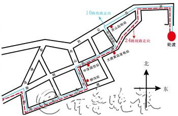 | 中泽国货门前受损严重的道路已经恢复通车。潘旭业 摄 |  | 10路、24路公交车调整示意图。 |