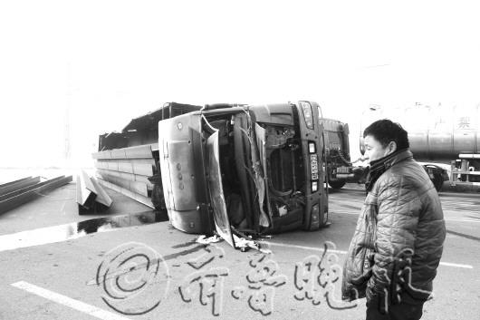 6日凌晨一点,李先生与司机到莱钢去运钢板,按照要求,他们要将钢板运到滨州滨北工业园区一家工厂。早上8点多,当他们自东向西行驶到该路段准备向北拐弯时,由于速度太快,拐弯太急,致使车辆发生侧翻,造成车上钢板被甩出,柴油泄漏,司机受伤。图中李先生仍不敢相信发生事故那一幕。 本报记者 刘涛 摄影报道