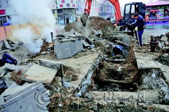 6日,在大世界步行街,威海市热电集团工作人员在对步行街内的蒸汽管道进行改造。工作人员介绍,蒸汽管道主要用于周围商业、医院的生产经营用气,为尽快修复管道,工作人员冒着热气在地下施工。