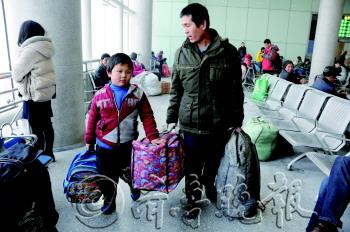 | 一位小朋友提着自己的行李和在外打工的爸爸回老家。 本报记者 姜文洁 摄 |