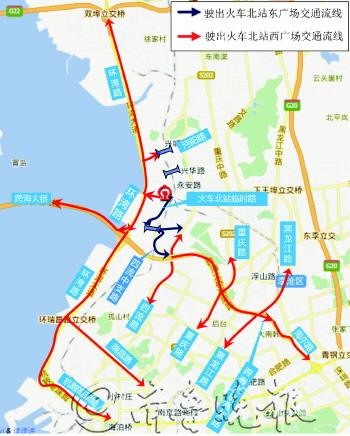 本报1月8日讯(记者 曹思扬 通讯员 陈刚 栾心龙) 8日,市交警支队发布火车北站周边道路交通组织方案。由于火车北站东广场仅限公交车和出租车进出,社会车辆统一停靠西广场,进出西广场分别有4条路线。市民如在早晚高峰时段去北站乘坐列车,尽量提前出行。 火车北站将于1月10日正式启用,近期共开行8对旅客列车,按满员计,每日到发旅客约18366人次。据了解,火车北站周边太原路、金水路以及安顺路等规划道路正处于施工中,北站西广场仅能通过环湾路进行集散,东广场可通过四流中路、太原路进行集散,且东西广场机动车通道暂不连通,仅有行人通道连通,整体通行条件较差。 目前,环湾路高峰时段交通流量基本达到饱和状态,早高峰时段为7:30—8:30,由南到北交通流量大;晚高峰时段为17:00—18:00,由北向南交通流量大。早晚高峰火车北站共涉及4列旅客列车,客流与交通流量叠加。 进出火车北站西广场分别有4条线路。目前,环湾路火车北站的信号灯已经启用,南北方向绿灯信号都是99秒,红灯时间约为12秒至14秒,东西信号灯绿灯时间为14秒,红灯时间约为110秒。 火车北站西广场停车场共有350余个停车位。东广场仅设置公交车、出租车停车场,未设置社会车辆停车场,非应急状况下东广场北部临时路仅限公交车通行,东广场南部临时路仅限公交车、出租车通行。 交警部门提醒,由于环湾路早晚高峰交通流量较大,加之与火车北站产生的交通流量叠加,易产生拥堵,早晚高峰乘坐火车的旅客尽量提前出行;早晚高峰往返机场方向的车辆可由青银高速绕行。交警部门已制定了交通应急预案,发生拥堵或交通事故时,将启动应急预案,对火车北站周边及相关联道路进行交通流限制或调整,请居民根据交警指挥或交通标志指示通行。 始发列车 车次 始发时刻 始发站 终到站 定员 G1268 6:15 青岛北 长春 约1028 G1208 6:25 青岛北 哈尔滨西 约1028 G1248 8:23 青岛北 沈阳北 约1028 K970 8:49 青岛北 通化 约1200 K956 17:59 青岛北 丹东 约1200 K1054 18:19 青岛北 延吉 约1200 K702 18:52 青岛北 哈尔滨 约1200 D660 未定 青岛北 北京南 约1299 终到列车 车次 到达时刻 到达站 始发站 定员 K1053 15:09 青岛北 延吉 约1200 K701 15:25 青岛北 哈尔滨 约1200 K955 16:22 青岛北 丹东 约1200 K969 16:54 青岛北 通化 约1200 G1207 19:26 青岛北 哈尔滨西 约1028 G1267 20:27 青岛北 长春 约1028 G1247 22:07 青岛北 沈阳北 约1028 D659 未定 青岛北 北京南 约1299 注:9日起,火车北站窗口售票业务正式开始办理。 → 进入火车北站东广场交通流线 1、四流中路-沧安路铁路桥涵洞(限高3.9m)-东广场临时路-火车北站东广场(仅限公交) 2、四流中支路或太原路-太原路铁路桥涵洞(限高3.9m)-东广场临时路-火车北站东广场(仅限公交、出租) → 进入火车北站西广场交通流线 1、杭鞍高架路或瑞昌路-环湾路-火车北站西广场 2、海尔路、黑龙江路、重庆路、四流路-胶州湾跨海大桥高架路(匝道限高2.2m)-环湾路-火车北站西广场 3、胶州湾跨海大桥-环湾路-火车北站西广场 4、双埠立交桥-环湾路-火车北站西广场 → 驶出火车北站东广场交通流线 1、火车北站东广场-东广场临时路-沧安路铁路涵洞桥(限高3.9m)-四流中路(仅限公交) 2、火车北站东广场-东广场临时路-太原路铁路桥涵洞(限高3.9m)-太原路或四流中支路(仅限公交、出租) → 驶出火车北站西广场交通流线 1、火车北站西广场-环湾路向南-杭鞍高架路或瑞昌路 2、火车北站西广场-环湾路向南-跨海大桥向西行驶 3、火车北站西广场-环湾路向北-沔阳路(限高3m)-四流中路 4、火车北站西广场-环湾路向北-双埠立交桥