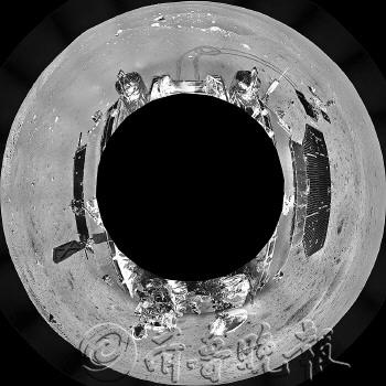 地形地貌相机拍摄的着陆器周边360°范围的全景镶嵌影像图,采用方位投影方式表达(2013年12月17日至12月18日摄)。