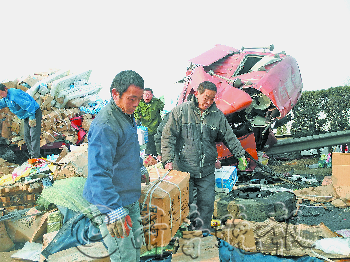 | 最后一辆追尾的货车受损最严重,车上人员一死一伤,货物散落一地。 本报记者 张亚楠 摄 |