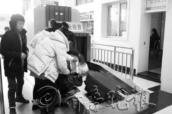 本报记者 张晓科 摄 |  | 进入候车厅的乘客正在进行行李安检。 |