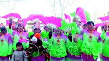 秧歌队全体队员高兴地换上新衣服,用上了新买的锣鼓、道具等用品,现场扭起了欢快的秧歌,并兴高采烈地合影留念。