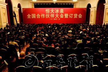 1月12日,2014恒大冰泉全国合作伙伴大会暨订货会在清远恒大世纪旅游城盛大召开。超过3000家经销商和商超代表以及200多家全国快消品、财经主流媒体记者参加了大会,创造了高端矿泉水领域合作伙伴大会的最高参会代表人数纪录。据了解,此次大会现场签约27亿元,截至目前,恒大冰泉在短短三十多天内全国签约量已达57亿元,平均每天签单金额近2亿,创造了矿泉水行业的又一个奇迹。 借力亚冠腾空出世 恒大冰泉“轰炸式” 营销深入人心 站在巨人肩膀上的出身决定了恒大冰泉的出世必定轰轰烈烈、风光无限。人们难以忘记,11月9日,“恒大”队在广州天河体育场成功夺冠,登上亚洲之巅!“恒大”亚冠登顶,让饱受诟病的中国足球终得一次扬眉吐气。11月10日,恒大集团宣布推出高端矿泉水产品——“恒大冰泉”长白山天然矿泉水。当天上午,吉林省领导、恒大集团领导以及恒大矿泉水集团领导出席了发布会,现场还举行了“恒大冰泉”全球推广大使受聘仪式。广州恒大足球队主教练兼恒大足球学校校长里皮、中国女排主教练兼广东恒大排球俱乐部主教练郎平、前世界足球先生菲戈、前西班牙兼皇马双料队长耶罗,出任恒大冰泉全球推广大使,完美诠释了恒大冰泉崇尚健康的产品特质。 以做人、做事之实而称著的恒大,借亚冠夺冠之际推出的“恒大冰泉”长白山天然矿泉水,让这个品牌一夜之间进入了全国人民的视线。随后而来的“爆炸式”的营销推广,更让这个品牌短时间内家喻户晓、深入人心。 据了解,恒大冰泉正式上市后,CCTV-1、CCTV-2、CCTV-3、CCTV-5、CCTV-新闻及全国数十家电视台黄金时段进行了全天候多频次报道;全国300家主流媒体进行了大幅的连续报道、宣传。同时恒大冰泉借力集团地产特色平台,利用恒大集团在地产行业进驻全国140多个城市290多个项目近300万业主的庞大营销平台及潜在消费群体优势,通过官网、广告、微博、微信、短信、各售楼部设现场展示点、桁架等措施进行产品宣传。 2013年12月30日至2014年2月1日期间,“发现冰泉品质,点亮健康中国”活动在新浪、腾讯、网易、搜狐、凤凰网五大门户网站同时启动。活动通过微博、微信、视频、网络互动游戏等一系列用户数巨大的互联网产品,与网友进行线上线下互动。丰厚的奖励吸引了众多网友参与,据统计,此次互动活动参与人数超千万,页面浏览量数十亿次。同时,活动还借助了网站的线下组织能力,通过鼓励网友发掘身边的恒大冰泉销售网点等形式,将线上线下有机结合在一起,真正意义上使网友近距离了解恒大冰泉的卓越品质。 三千人共签27亿 经销商边“拍心口”边抢恒大冰泉代理权 1月12日,面积超过1000平方米的清远恒大世纪旅游城华夏厅主会场被来自全国的经销商和商超代表挤得满满当当,主办方特地准备的两个分会场也坐满了人。在恒大集团董事局主席许家印讲话的时候,甚至有部分参会代表直接站到了过道旁听。 据介绍,此次大会恒大矿泉水集团已建立销售分公司的332个市级区域均有经销商代表出席,同时,包括了北京、上海、广州、深圳、天津在内的全国众多重点区域的快消品龙头经销商、最具影响力的商超系统代表,也都参加了会议。渠道全面覆盖了沃尔玛、华润万家、家乐福、易初莲花、乐购等大型卖场以及全国所有片区的快消品分销系统。参会的经销商及商超代表超过3000,创造了高端矿泉水领域合作伙伴大会的最高参会代表人数纪录。 “灰霾天气让人们的健康意识大大加强,对健康饮品的需求明显增加。恒大冰泉从面市起就树立了安全天然健康的形象,各销售网点天天有需求反馈,产品前景看好。”来自北京的经销商赵先生说出了自己对恒大冰泉的理解。这位与北京及周边地区数百家销售企业、数千家便利店以及餐饮企业有长期紧密合作关系的经销商,在大会现场签下了6000万的订单。 现场有许多经销商表示,在恒大铺天盖地的宣传下,自己了解了冰泉的卓越品质,也对恒大集团有了更多的认识。有恒大实力做保障,“轰炸式”的宣传开路,自己不怕冰泉没销路。来自天津的经销商杨先生现场订货1亿元,他称,从旗下渠道反馈的销售及顾客咨询情况分析,恒大冰泉在华北地区急剧升温,需求量巨大。恒大冰泉也很好的填补了其代理的矿泉水产品的高端品牌空白,他看好冰泉的市场前景,明年订货额还要翻番。 据了解,此次大会现场签约27亿元,截至目前,恒大冰泉在短短三十多天内全国签约量已达57亿元,平均每天签单金额近2亿,创造了矿泉水行业的又一个奇迹。