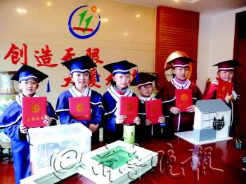 | 14日,六名小学生身穿“小院士”服装,手拿获奖证书和自己的作品合影留念。