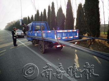 1月13日上午,一辆三轮车捆着两捆10米长的钢筋,分别挎装在三轮汽车两侧私自加装的铁架上,由于车门已被钢筋挡住,拉载的超限货物将车门挡住,司机上车下车只能通过车窗中钻进钻出。