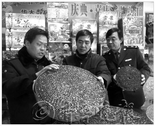 1月14日,莱芜市工商局莱城分局凤城工商所的执法人员在辖区内的烟花爆竹销售点进行检查,检查内容包括经营许可证、产品种类、生产时间、防伪标识等。据了解,每年春节前期,为确保烟花爆竹市场规范有序运行,市工商局都会组织开展烟花爆竹市场专项整治活动,对无证经营烟花爆竹的销售点予以取缔,对采购、销售的非规定品种和规格的烟花爆竹予以依法查处。