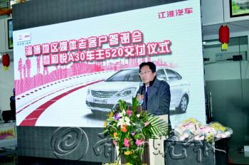 值新春佳节来临之际,为答谢广大新老客户长期以来的支持与厚爱,淄博金悦江淮轿车4S店于1月12日上午10点,在展厅内隆重举行了“江淮岁末答谢会暨和悦A30“520”发放仪式”。尽管上午天气较阴冷,也没能阻挡广大新老朋友们前来参加活动的热情,现场门庭若市,热闹非凡。最终答谢会现场共实现订交46批。 活动到场人数众多,客户签到积极,工作人员服务热情周到,客户对于活动的举办表现浓厚的热情与期待。 答谢会现场所有顾客进店即有精美金万通金仔赠送,并可参答谢老客户的现场抽奖活动,活动分为幸运奖、一、二、三等奖。获奖客户对于此次活动成功举办表示感谢,并对自己使用的江淮轿车非常满意,并表示尽力将江淮轿车推荐给更多的亲朋好友使用。 淄博金悦江淮轿车4S店答谢会圆满落幕,淄博金悦江淮轿车全体员工再次感谢大家对江淮汽车的大力支持,淄博金悦全体员工会继续加油,为大家提供更好的用车服务。 如果您身边朋友或家人对江淮轿车感兴趣,可以邀请至4S店赏车、试驾;您如果因故没能赶上此次的答谢会,没关系,淄博金悦江淮轿车4S店每天都会将有关江淮轿车的最新资讯、店内的最新活动动态,最新优惠政策进行发布,同时您也可以来淄博金悦江淮轿车4S店展厅详谈,将会有意外惊喜带给您哟,活动不断,精彩继续!淄博金悦江淮轿车4S店恭候您的光临! 新的一年里,淄博金悦江淮轿车4S店将继续用最真诚的服务为客户提供更加优质的服务体验,让每一位江淮客户都能够分享淄博金悦江淮轿车带给自己的快乐生活! 淄博金悦总经理刘华乡致开幕词