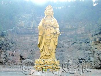 | 滴水崖附近的庙宇。 |  | 崖上流下的水,在冬季全部凝结成了冰瀑。 |  | 山崖脚下湖面已结成厚厚的冰层。 |  | 滴水崖前,有一尊鎏金“滴水观音像”。 |  | 檀抱泉上的青檀苍劲有力。 |