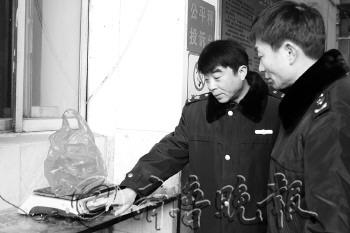 | 工商执法人员在公平秤上核实基围虾斤数。本报记者 高雯 摄 |