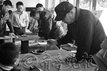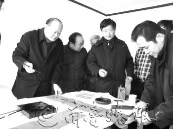 记者 凌文秀 摄 |  | 书法名家们现场挥毫,市民们在旁耐心等待。 本报记者 凌文秀 摄 |  | 山东省文艺志愿者服务团在第三届山东省书法家协会“百县千村”书法下乡活动中,聊城高新区书画协会田俊国主席,李明常务副主席组织区内书法家和书法爱好者免费为千家万户撰写春联,受到群众的欢迎好评。(王忠 摄) |