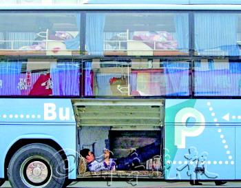 自述:卧铺大巴车司机趁着停车在行李舱内休息。