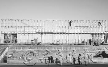 20日,中心广场上,几十平方米大的美化展示屏正在紧张安装中。据施工人员介绍,此电子显示屏建成后可起到美化和宣传的作用,安装工作将在春节前完工。 本报记者 王小会 摄