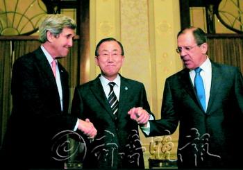 | 21日,瑞士蒙特勒,美国国务卿克里、联合国秘书长潘基文以及俄罗斯外长拉夫罗夫(从左至右)在三边会谈结束后握手合影。 |