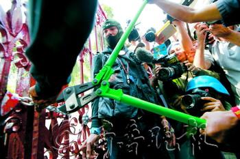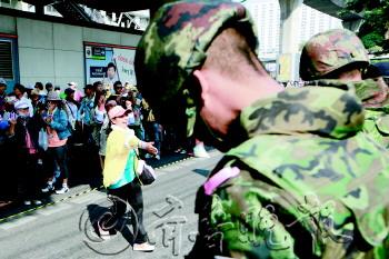 | 22日,泰国首都曼谷,反政府示威者在集会时破坏警察总部大门。 新华/美联 |  | ◥22日,泰国首都曼谷,一名反政府示威者试图与一旁的士兵握手。 新华/美联 |