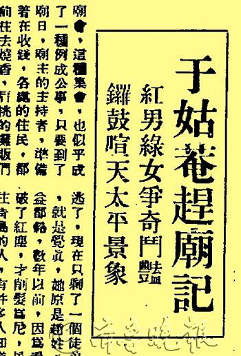 历史上,青岛人的过年风俗是“忙腊月、耍正月”,所以,老青岛多数行业过年时要休息十多天,与此相应的是青岛正月里有一系列庙会,如正月初一开始的天后宫庙会、正月初九开始的清溪庵萝卜会、正月十一开始的于姑庵庙会、正月十六开始的海云庵庙会等等。老青岛有关过年逛庙会的记忆文字有许多见诸报端、书籍,而笔者收藏的20世纪30年代《青岛民报》、《青岛晨报》中有关青岛市民过年逛庙会的新闻报道,从另一视角,原汁原味地为我们描绘了老青岛人正月里的市井图画。 □曲海波 天后宫庙会: 民间艺人载歌载舞 位于太平路上的天后宫建于明代成化三年(1467年)。正月初一开始的天后宫庙会由来已久,天后宫庙会又称“新正庙会”(新春正月的意思),曾任青岛中华商公局董事的胡存约在其专著《海云堂随记》中记载:“自元旦至元宵,日日人群络绎,杂耍、小场、大书、兆姑(茂腔)、梆柳(柳腔)、秧歌(胶州大秧歌),江湖把式无所不有……” 1933年2月10日出版的《青岛民报》以“废历元宵,本市天后宫之一瞥”为题,浓墨重彩地记述了是年天后宫春节庙会的热闹场面。当时在正月里赶天后宫庙会是许多青岛市民重要的节日活动,由于赶庙会的人纷至沓来,天后宫内外,“热闹异常,拥挤不堪,各式车辆,停满宫前,使凋残之树枝,亦含笑颤动而迎香客……”;天后宫外,民间艺人“手执锣鼓,载歌载舞,状如小丑,其神态令人醉倒,口中念念有词,据熟悉音调之人谓其系中州古音云”。如今,为了发扬青岛民俗历史传统文化,每年春节,青岛市有关部门都在天后宫举办农历除夕“吉祥钟声迎新年”撞钟活动和正月“新正民俗文化庙会”,让青岛市民和中外游客在新春欢乐中感受青岛民俗文化的历史魅力。 清溪庵萝卜会: 男女老幼挤满人行道 青岛历史悠久的萝卜会,也叫清溪庵庙会,清溪庵俗称“下村庙”。每到正月初九,乡里乡亲云集清溪庵,烧香拜佛,祈福求安。 至于清溪庵和萝卜是怎样搭在一起的,大致的说法是,因为正月初九为立春前后,民俗有“咬春”的习俗,民间有“正月初九吃萝卜不牙痛”的说法,附近各村村民都挑着萝卜来此售卖。因为庙会上卖萝卜的居多,所以清溪庵的庙会就有了一个俗称“萝卜会”。 从1940年的《青岛新民报》的标题为《清溪庵萝卜会颇有历史价值》的新闻报道,可见当时萝卜会的热闹。1947年的《军民日报》登载《逛萝卜会》一文写道:“道路两边商贩甚多,行人拥挤不堪。路旁有卖糖葫芦的,有卖杂耍物的,有卖糖果萝卜的,有卖香纸的,有乞丐,还有燃爆竹的,确实热闹。”由此可知,到了上世纪40年代,萝卜会就已经成为众所周知的称谓了。 于姑庵庙会: 龙灯旱船热闹非凡 于姑庵位于青岛市市北区错埠岭村东南的半山坡上。20世纪30年代,许多摊贩正月初九赶完萝卜会,正月十一转移来赶于姑庵庙会,小戏班等艺人也来赶台。 1935年2月15日出版的《青岛晨报》刊发了题为“于姑庵赶庙记”的新闻报道。当时于家庵庙会的规模,从记者笔触中可略见一斑:“从市内到东吴家村通于姑庵的路上,赶会的人们,列着队,不断地向前走着,三个一簇,五个一堆的,说着,笑着,慢慢地向会上出发,你看吧,长袍的男子,西装的男子,短服的男子,漂亮的男子,老态龙钟的老翁,和那些旗袍剪发的时髦女子,短装留髻的乡下姑娘,涂脂扑粉的少妇,白发驼背的老婆,满眼里尽是人。” 庙会上,拉洋片的、卖小吃的摊子面前,游人看得目不转睛,吃得津津有味;“什么香纸一毛钱、月份牌五个子”等各种叫卖声不绝于耳,还有鞭炮声、笑语声、人语声,喧嚣热闹。岛城许多娱乐团体使出浑身解数表演各种节目助兴,其中“有西吴家村的圣诞雅乐团,有仲家洼的同乐会,有小村落的俱乐部,有的是旱船,有的是龙灯,他们都在锣鼓喧天,乐声悠扬中,做着不同的表演。”吸引着游人们里三层、外三层地观看,乐不可支。 四方海云庵庙会: 热闹似南京路 作为岛城市民春节娱乐生活的重头戏,正月十六至十八的四方海云庵庙会,自然成为当时报纸新闻关注的重点。当时报纸形容海云庵庙会“游人如鲫,小贩利市三倍,乡下人争看摩登小姐。” 从1935年2月20日(正月十七)出版的《青岛民报》题为“废历正月十六日(2月19日)四方海云庵的盛会”新闻报道的字里行间中,颇能感受当年四方海云庵糖球会的盛况规模:“因为四方是一个工业区域,具有大纱厂三四家,和其他各种工厂多家,虽然工厂并不休假,但是工人们却是因为这会期,一个年度仅有一次,宁肯把工薪牺牲上一天,也要去逛逛庙会。在这种情形之下,这偏僻的四方,竟成了一个重镇似的,万人空巷了,整个四方村中的各个小胡同里,小巷子里,都是充满着游人……照那种情势看来,恐怕连上海极热闹的南京路,也没有那种盛况。” 进入二十一世纪的今天,四方(今区划合并为市北区)海云庵糖球会继承发扬历史传统民俗文化,糖球会浓厚的民俗文化内涵,激活了人们对民族民间文化艺术的热爱和崇尚。