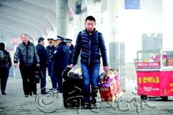 过年回家,人们都习惯为亲朋好友准备些礼盒礼品。22日,在德州火车站,很多旅客拎着大包小包下车。 本报记者 马志勇 摄