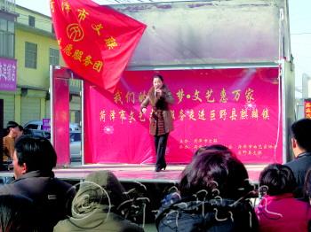22日,“我的中国梦—文化惠民进万家”菏泽市2014年春节“送欢乐下基层”活动第一天,市文艺志愿服务团走进巨野县麒麟镇,为当地群众送去了精彩的文艺演出,并为当地文化大院捐赠图书1000余册。随后,市文联工作人员又为王庄村、杨官屯村中的7家困难户送去慰问品及慰问金。